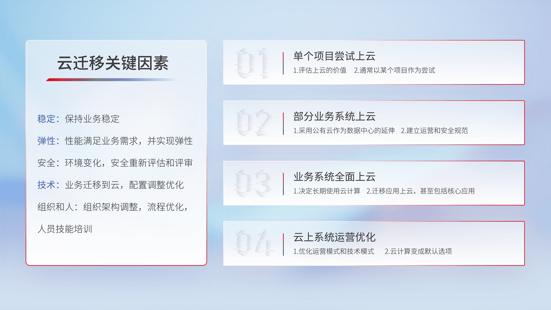结合实际业务,,,从规划设计、、、云平台选型、、、、云原生改造、、、数据迁移、、集成交付,,,迁移全过程为客户识别最佳上云路径,,,,做好风险识别管理,,,设计网络架构、、、、身份权限、、、、安全审计合规、、、、操作审计、、日志审计、、、、监控告警策略、、、、多站点容灾设计等,,,,对云上基础设施进行整体规划,,,,提升IT治理水平,,,,以满足弹性、、、高可用、、、高性能的需求。。。