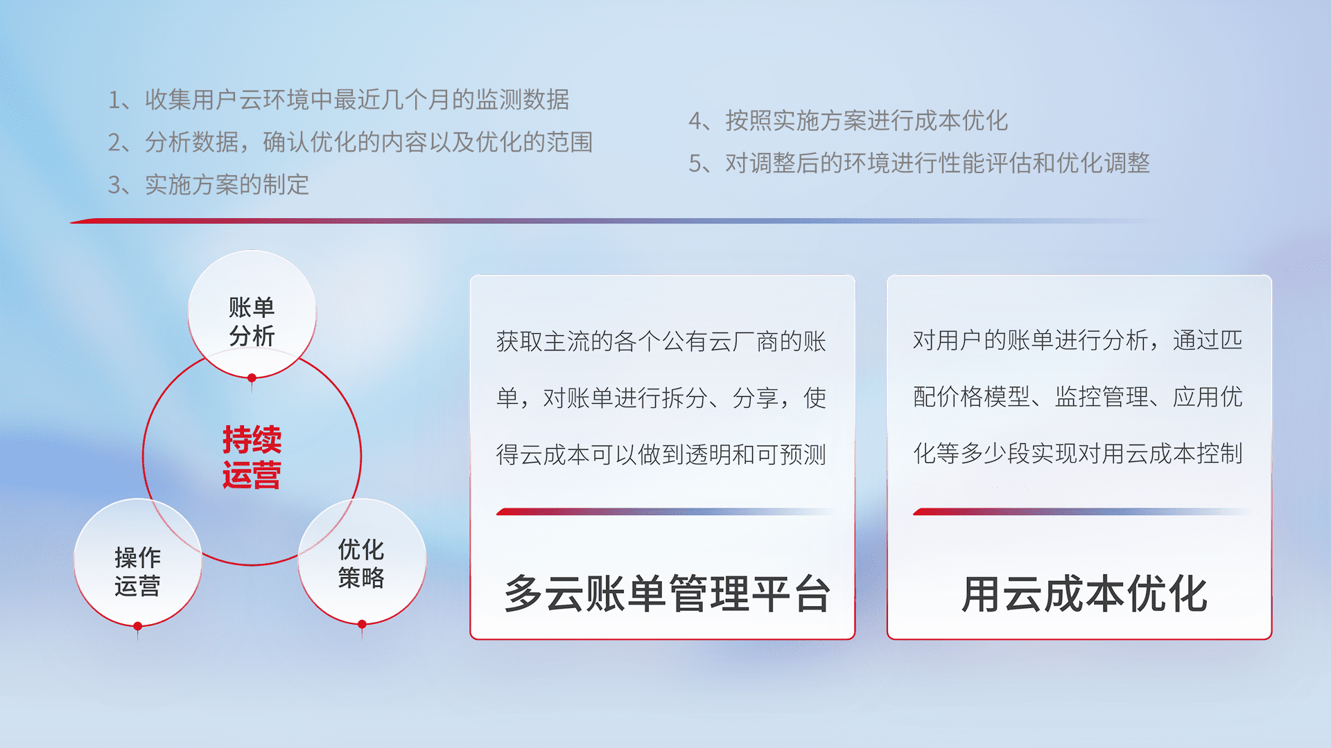 通过多云纳管,,以统一的资源数据模型把客户的云资源进行抽象和封装,,,,进而实现对多云资源的统一操作,,保障云资源管理的可靠性、、稳定性与可用性。。量身定制化运维内容,,配置、、、、开发运维、、、补丁管理、、备份、、、监控、、、、认证和访问管理、、审计和日常巡检等,,保障在用云过程中的可靠度,,稳定度以及高可用率。。